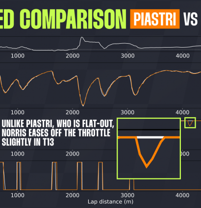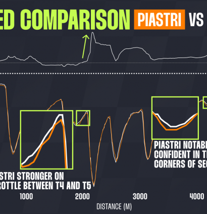 Just like here, Piastri was faster in the fast T4–T5 sequence and in the high-speed sector from T12 to T15, while Norris attempted to recover time in the slower Turn 10.
