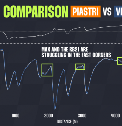 From the graph below, you can see the sharp rise of the white delta line on Piastri’s side.